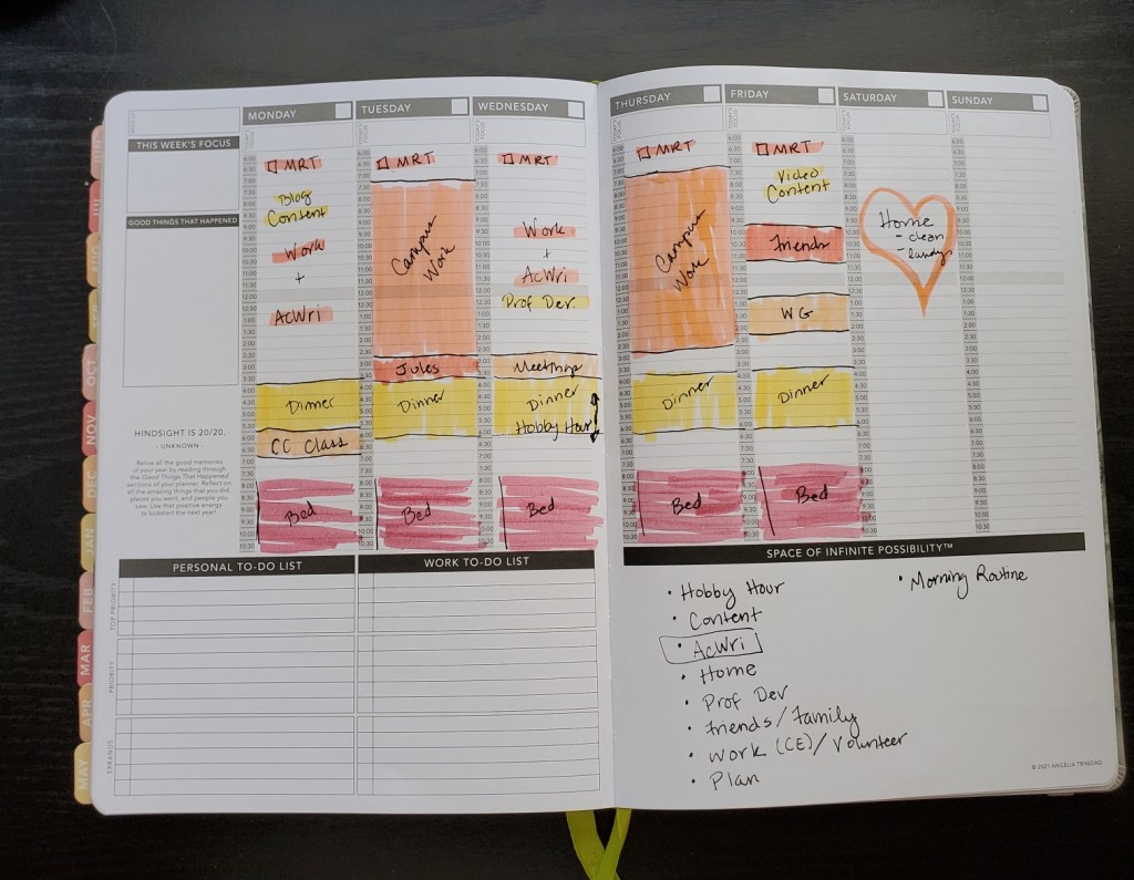 I have done an ideal week exercise in the past, but not every semester. Mostly because I wasn’t entirely sure what the point was. I would make the schedule, then promptly forget about it, and finally ride the tidal wave of obligations to the next semester. And I don’t think I ever truly experienced an ideal week. Ever. Things always derailed even the least-scheduled weeks. Unanticipated administrative tasks ballooned to fill all available space (I spent the first week of this semester, for example, putting together a needlessly complicated portfolio for a multi year contract). Personal tragedy came knocking. And sometimes I was just too mentally fatigued to take advantage of open spots in my schedule. I also secretly resisted the idea of creating a schedule to help me do more uncompensated labor even though I really like research and writing (for context, I am not in a tenure track role).