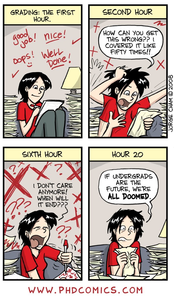 This might be too strong a sentiment, but I couldn’t think of another ‘s’ word for embarrassment. What I mean is that sometimes, especially when we are teaching a course for the first time and/or we had little time to prep our courses (#adjunctlife), grading shows us that we kind of…failed. There’s nothing quite like sprinting or slogging through 100 students projects only to realize you forgot to teach them *insert important skill or concept here.* If you care at all about doing your job well, it can be incredibly dispiriting to see piece after piece of evidence that you bungled the assignment. If this happens to you, don’t despair. Make a note of what went wrong and what you’ll do next time to fix it. Then, move on. Of course some faculty write it off as the students’ fault, but if the vast majority of them didn’t do well, that’s on you, my friend.